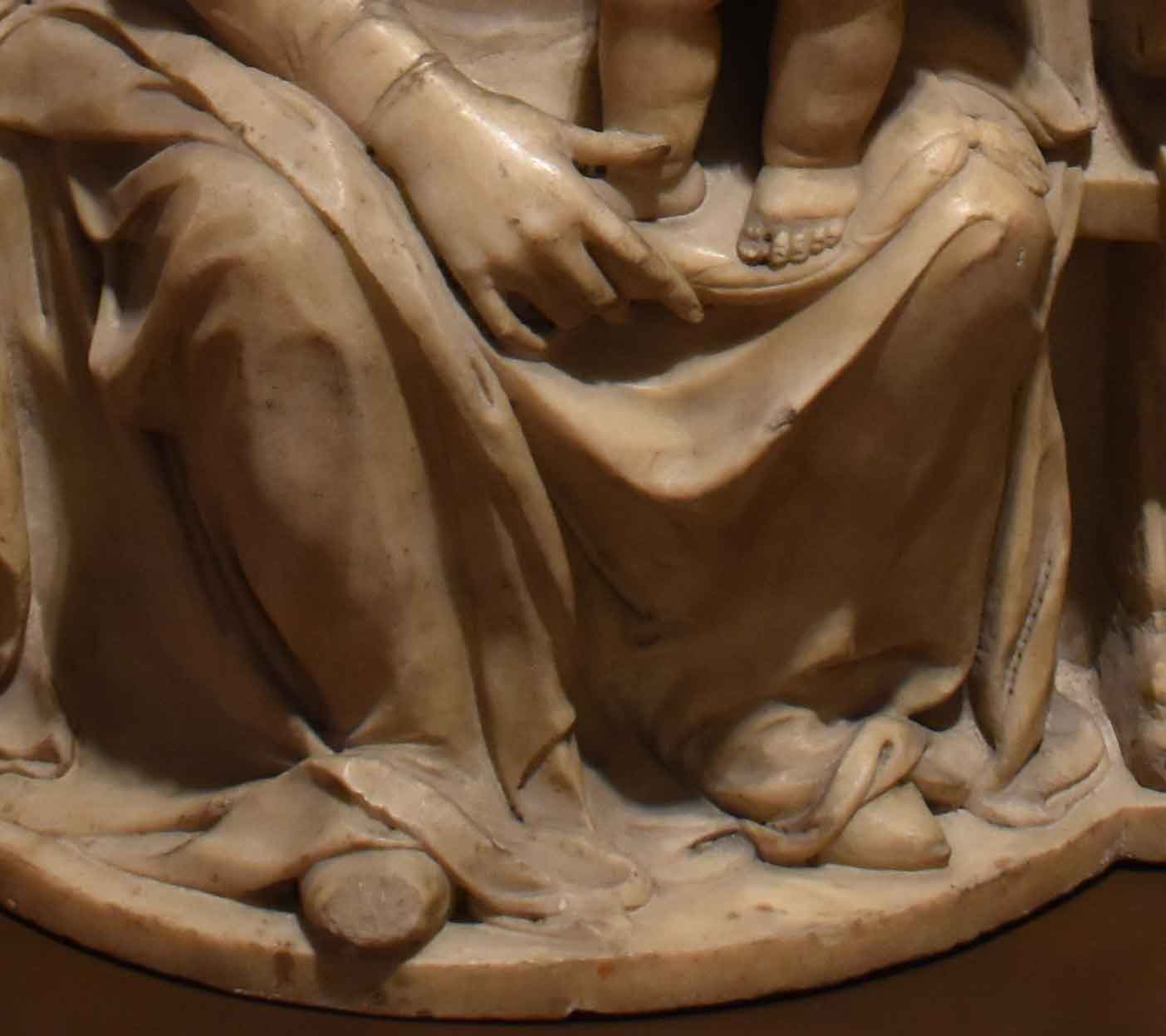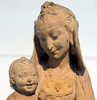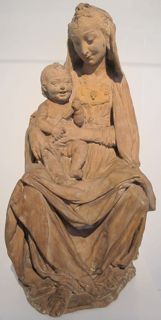 Tutti i dettagli che il Prof. Caglioti ha elencato come elementi leonardeschi, le mani, la testa, il bambino e il drappeggio sono simili a quelli di tante altre Madonne del Rossellino. Leonardo non avrebbe mai fatto un bambino così sorridente e soprattutto con la bocca troppo aperta… (è antiestetico ma soprattutto i suoi Gesù bambini sono sempre seri poiché consapevoli del destino che li attende) |