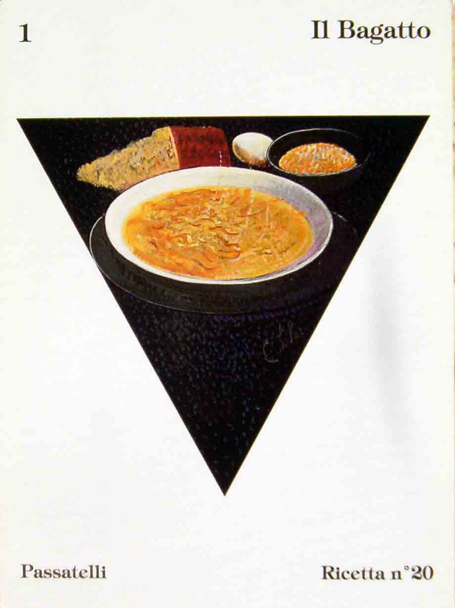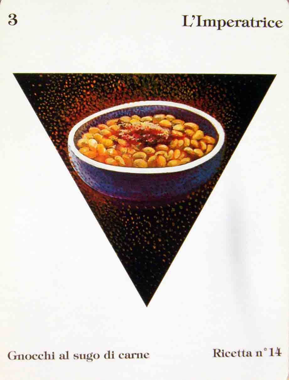 Leggendo il libro di ricette dell'Artusi ho pensato di scegliere gli archetipi, cioè quelle ricette più famose e più rappresentative della gastronomia nazionale, al tempo dell'Artusi, con una predilezione verso i piatti delle terre a cui l'Artusi era più legato non escludendo però anche altre simboliche presenze regionali. A questi Archetipi ho pensato poi, mantenendo una certa coerenza con lo spirito guida di questo libro e col carattere dei miei abituali ambiti operativi, di abbinare all'archetipo l'allegoria simbolica ed arcana dei Tarocchi. Ne è scaturito una simpatica e miracolosa pozione di caratteri, di sapori, di forme, di colori, di gusti , di energie e di curiosi abbinamenti o legami che trovano nello stivale nazionale il magico collante di storia , di cultura e di tradizioni che caratterizzano il vero gusto culinario nazionale a cui il grande Mago Artusi ha saputo così mirabilmente dar vita. Artusi si è rivelato, con vero intuito da veggente, e con l'abilità di un narratore, il primo interprete di un gusto nazionale facendo tesoro delle sue conoscenze culturali, sociali e psicologiche, riuscendo, con maestria divinatoria, a raggiungere l'Opus Alchemico, l' oro filosofale del Gusto Italico.
